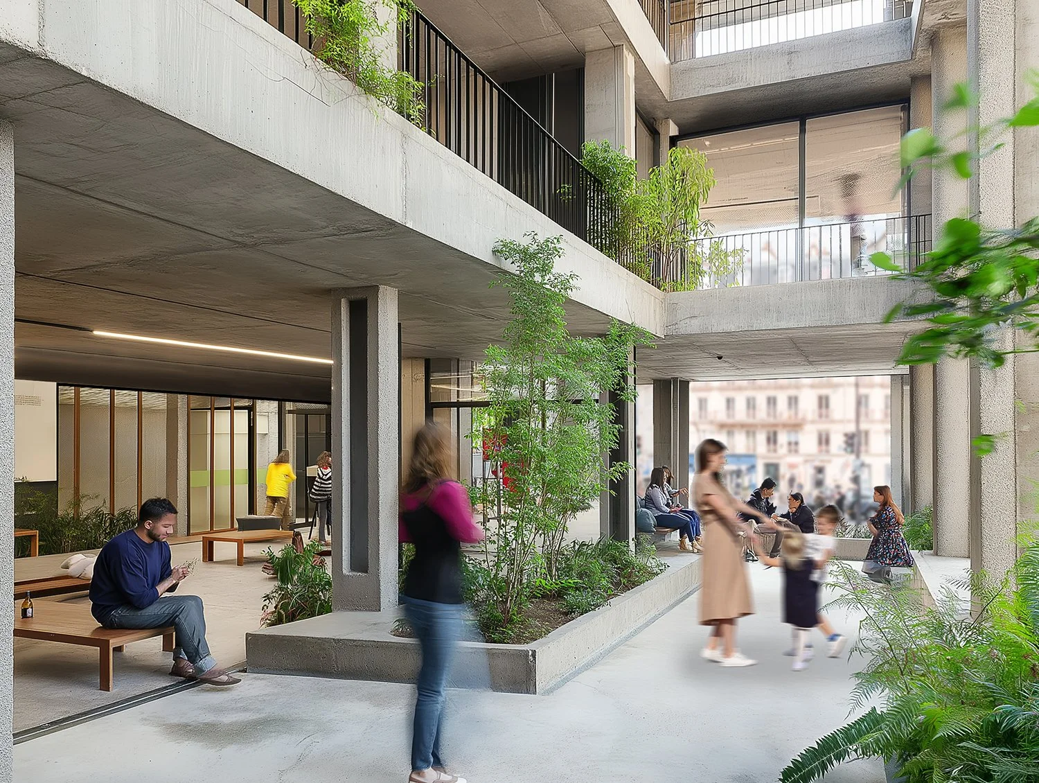 Enfin, les circulations et espaces partagés sont repensés pour favoriser les usages collectifs, en créant un lieu de vie évolutif, durable et cohérent avec les enjeux contemporains.